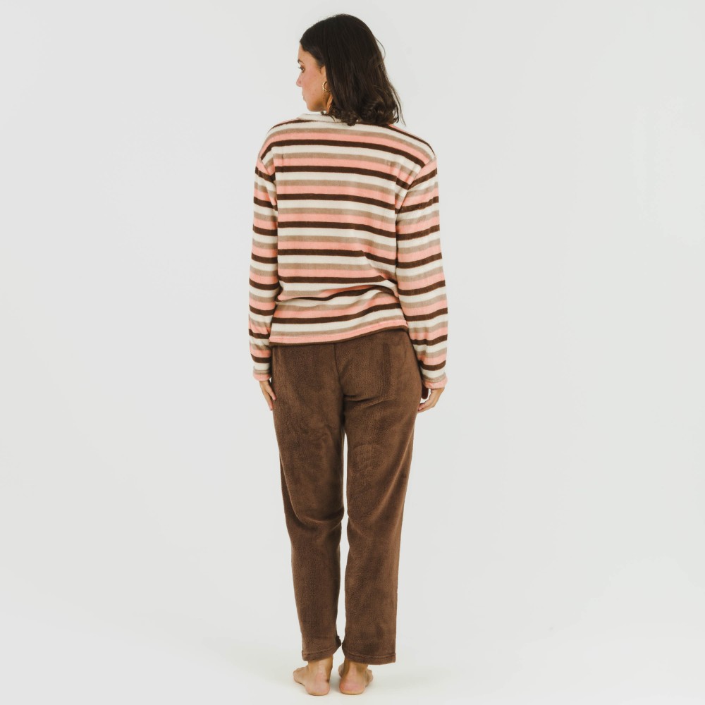 El pijama incluye una camiseta de rayas marrones, rosas y blancas y un pantalón de color marrón chocolate.