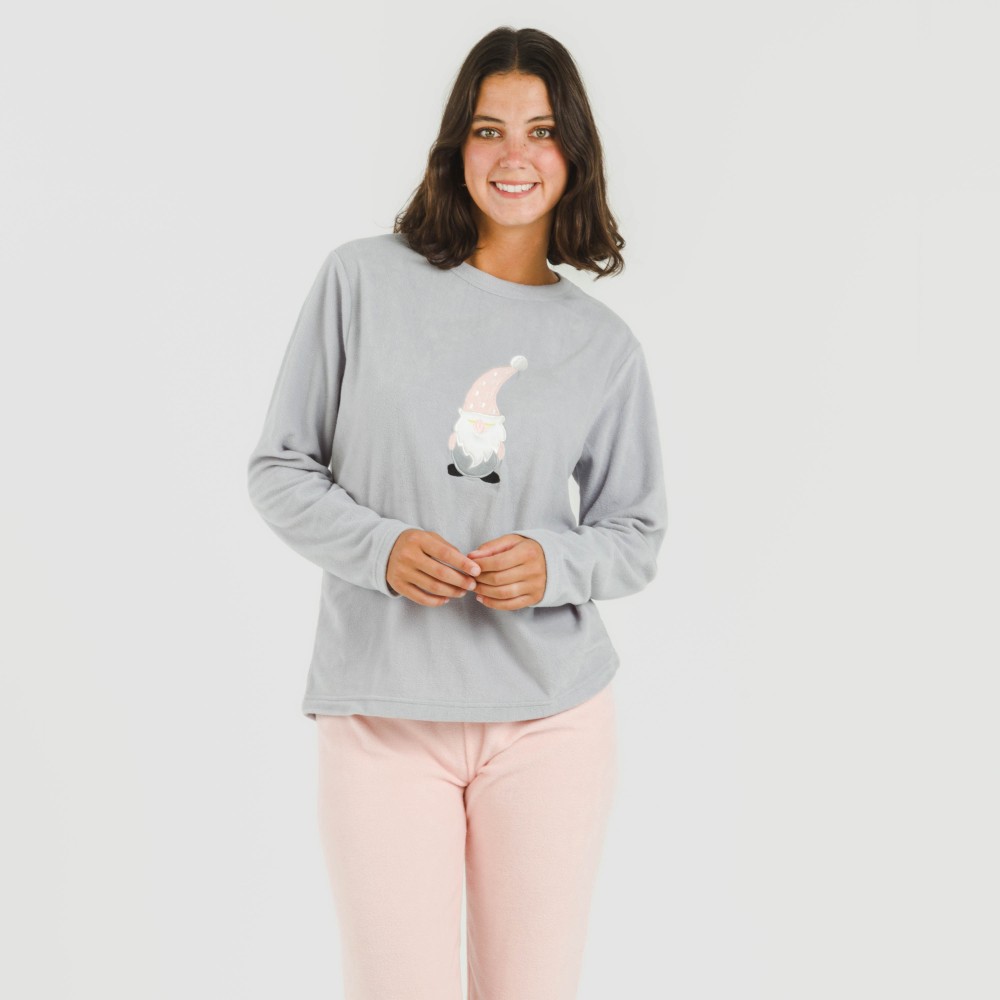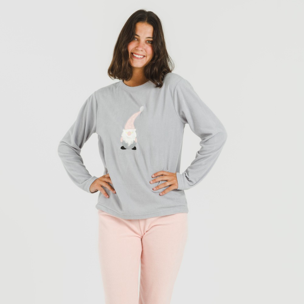 Pijama cómodo con camiseta de color gris con estampado de gnomo en la parte central y un pantalón de color rosa liso.