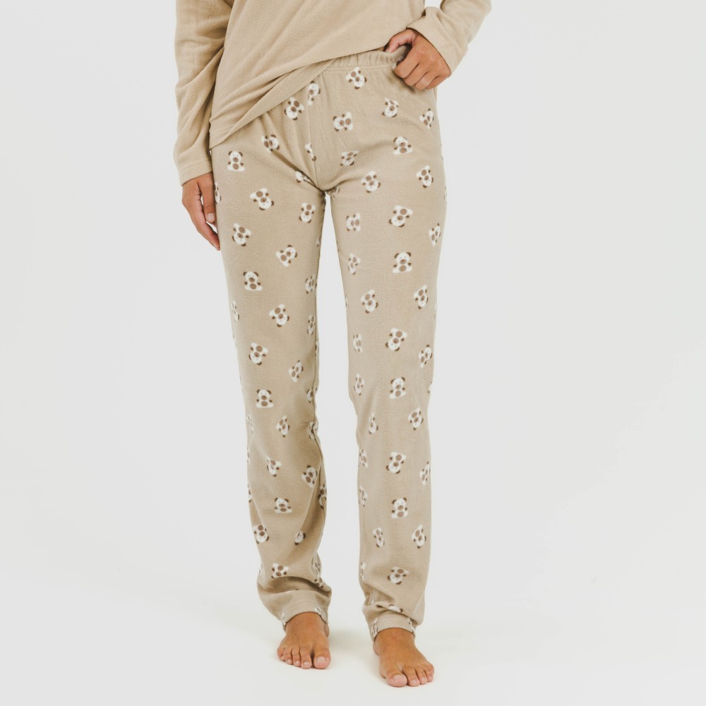 Pijama cómodo con camiseta de color arena con osito en la parte central y un pantalón de color topo con estampado de pequeños ositos.