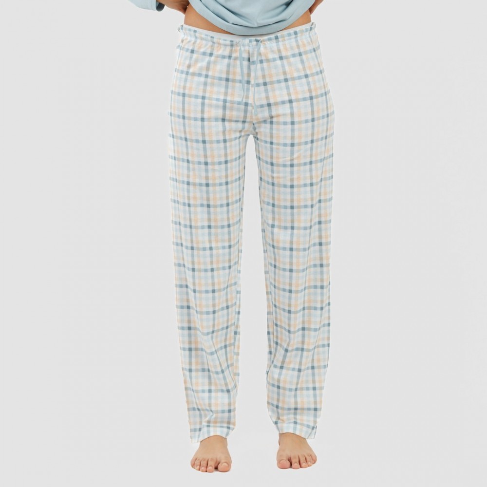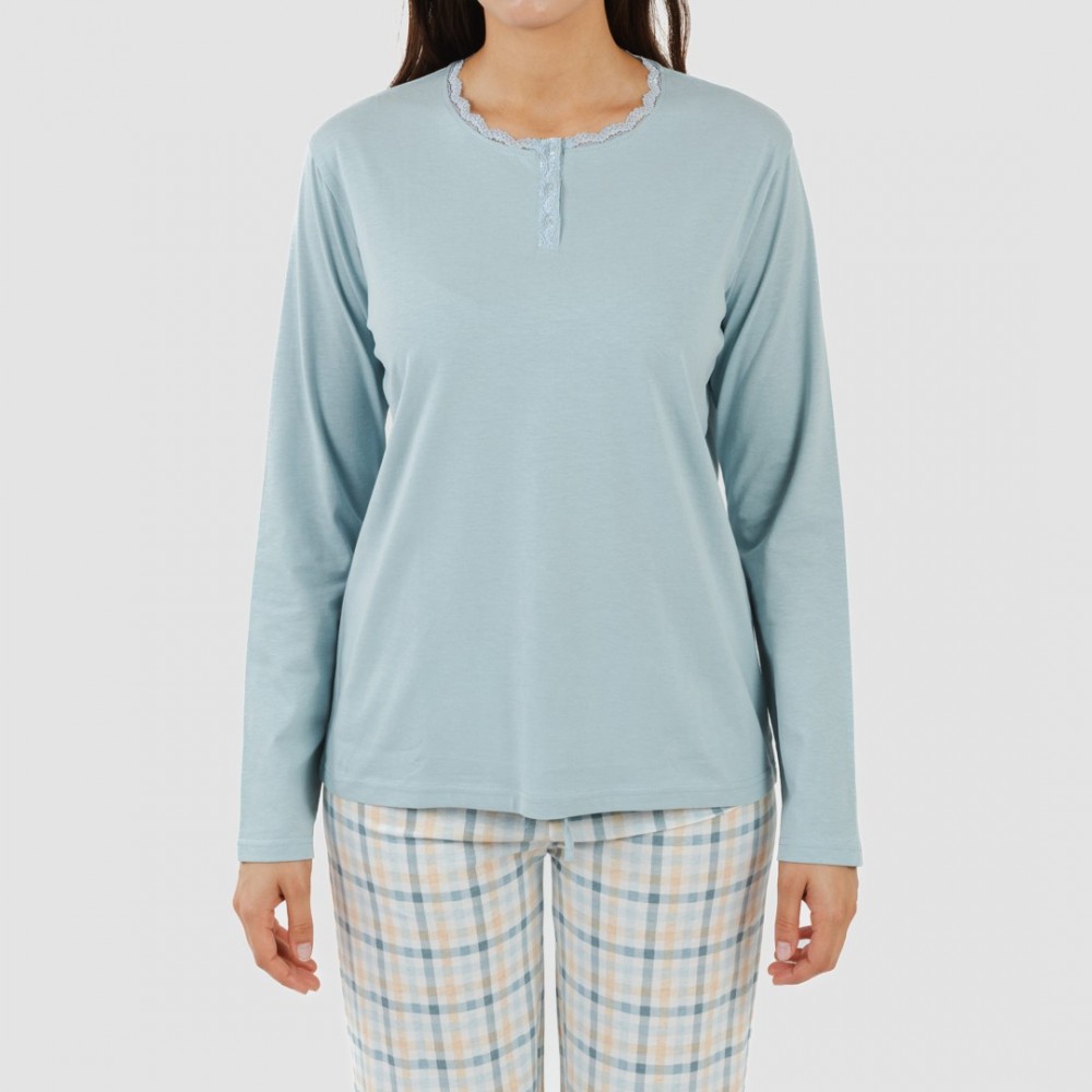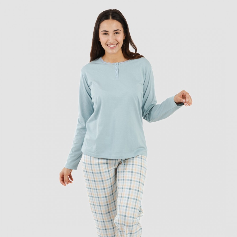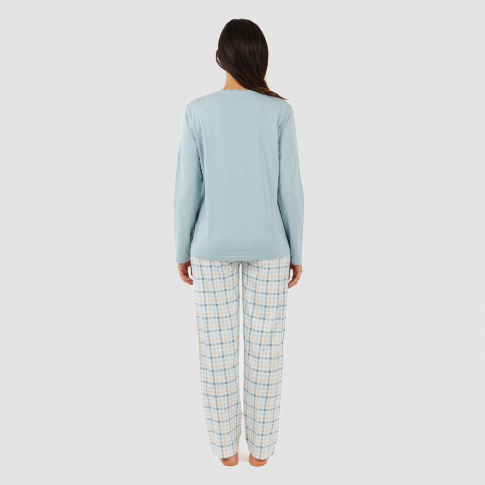 El pijama se conforma de una camiseta lisa de manga larga en color azul con tres botones pequeños en la parte del cuello y un pantalón de rayas y cuadros en tonos azules y arena sobre un fondo blanco. El pantalón del pijama tiene la cintura elástica recubierta con una cinta para ajustar.