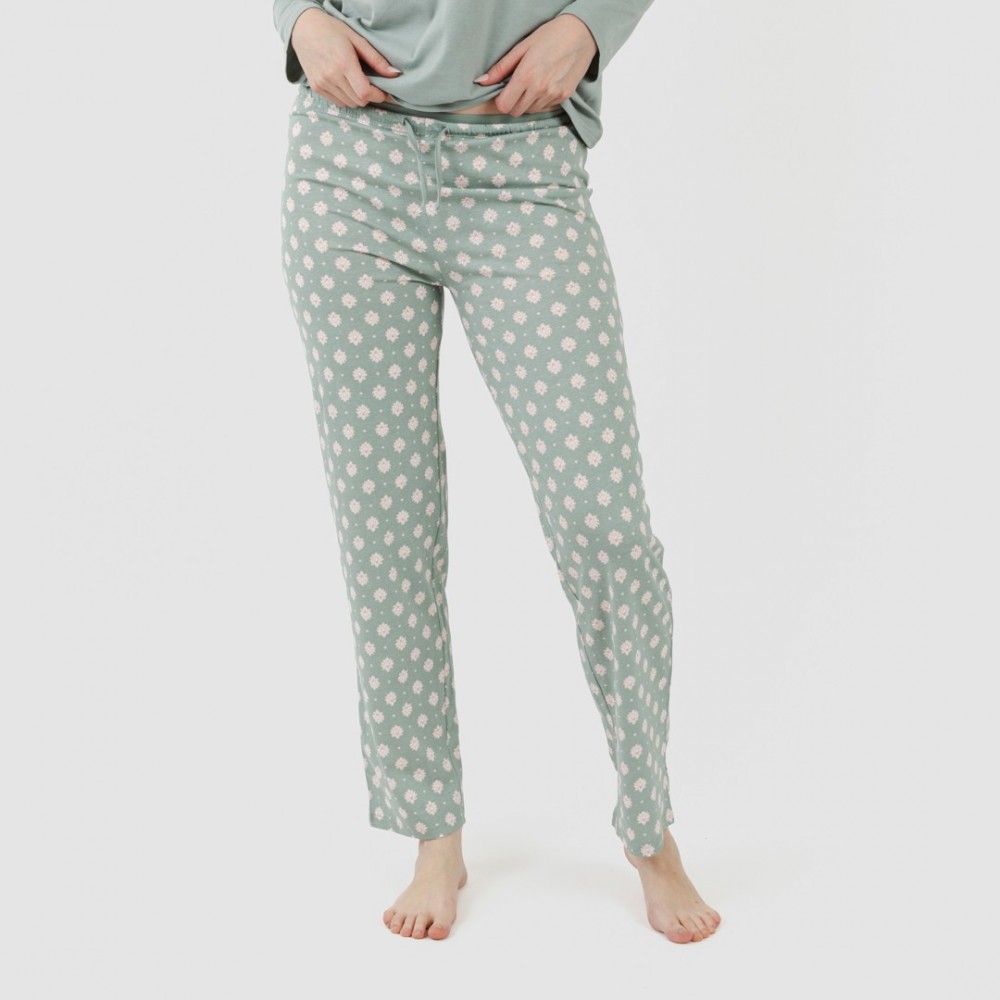 El pijama se conforma de una camiseta lisa de color verde cacería con una frase en la parte central de color blanco "Good vibes" (buenas vibraciones) y un pantalón con estampado de flores blancas sobre un fondo verde. El pantalón del pijama tiene la cintura elástica recubierta con una cinta para ajustar.