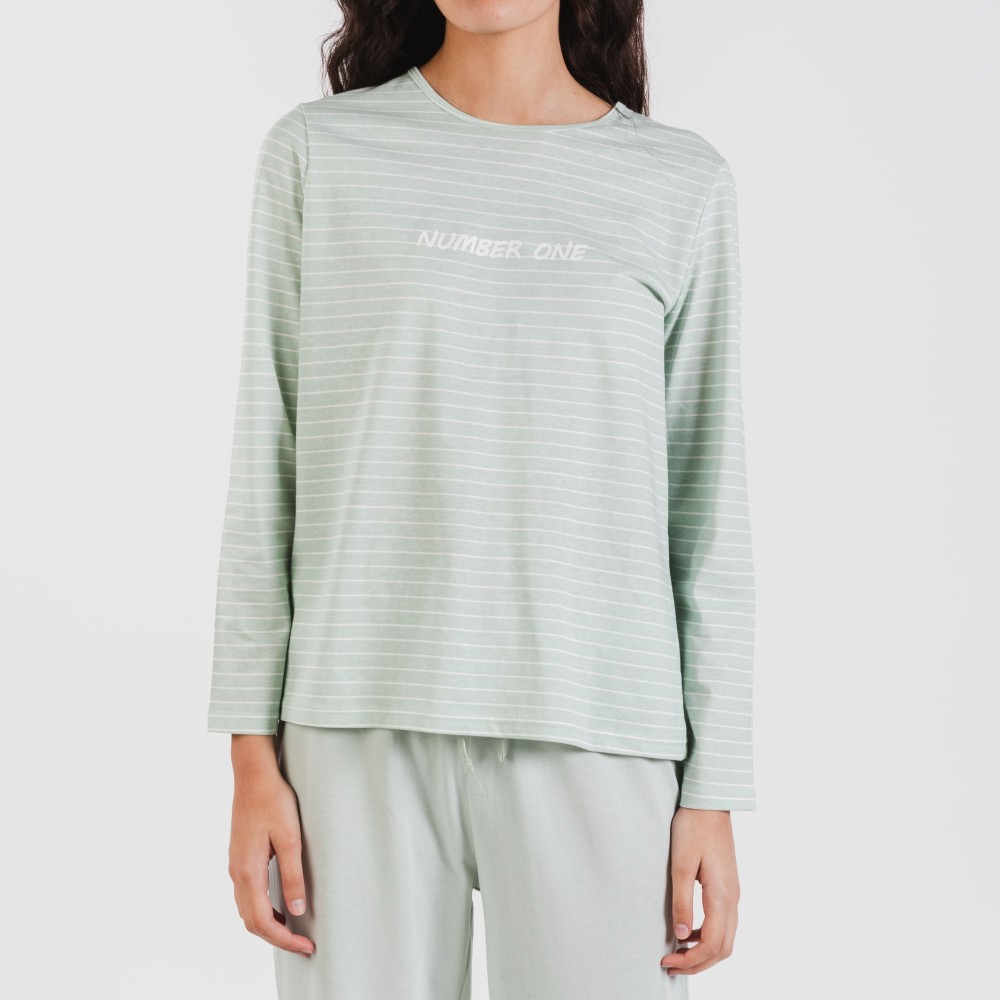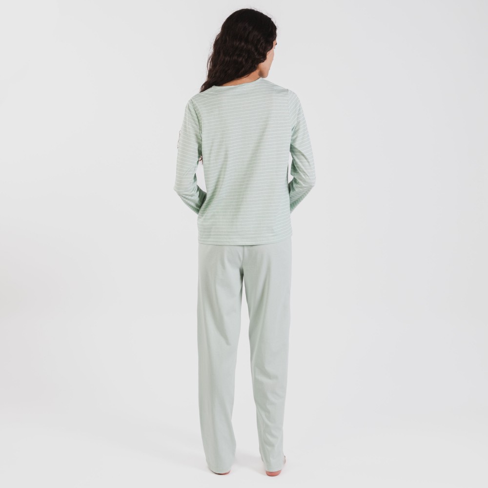 El pijama se conforma de una camiseta en color verde tiffany con rayas blancas y frase "Number one" y un pantalón liso de color verde claro. El pantalón del pijama tiene la cintura elástica recubierta con una cinta para ajustar.