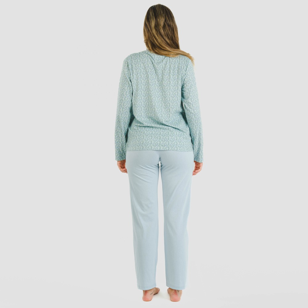 El pijama se conforma de una camiseta de pequeñas flores en tonos azules, blancos y verdes sobre un fondo celeste y un pantalón liso de color azul. El pantalón del pijama tiene la cintura elástica recubierta con una cinta para poder ajustarlo.