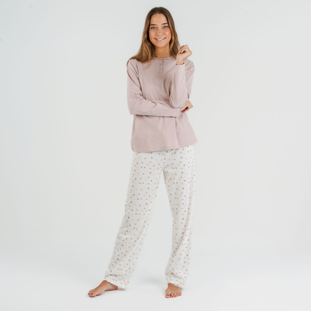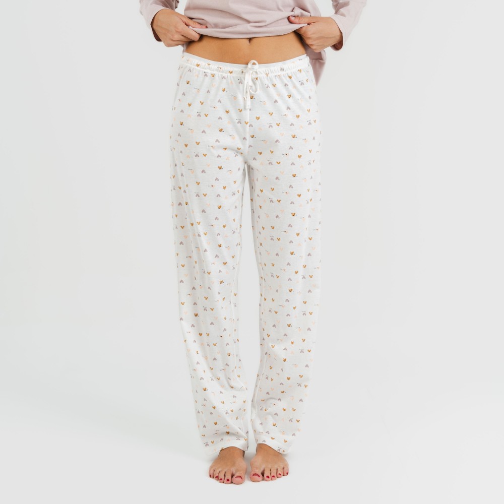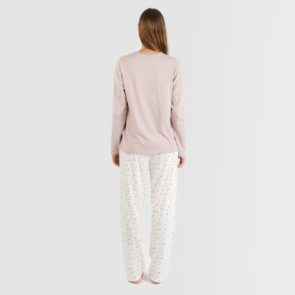 El pijama se conforma de una camiseta lisa en color malva con tres botones en la parte del cuello y un pantalón con estampado de pequeños corazones en tonos arena sobre un fondo blanco. El pantalón del pijama tiene la cintura elástica recubierta con una cinta para poder ajustarlo.