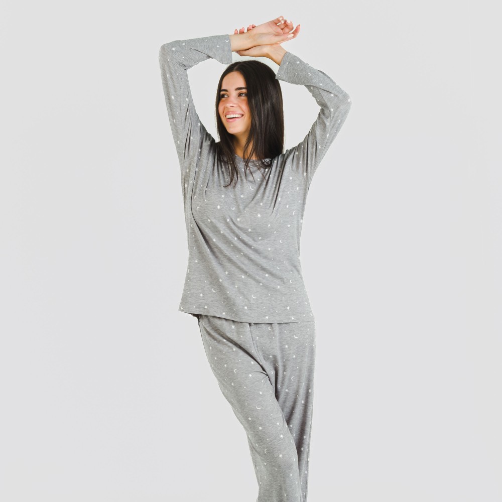 Pijama de mujer modelo Ambarina gris marengo compuesto por camiseta de manga larga y pantalón largo de tacto suave.