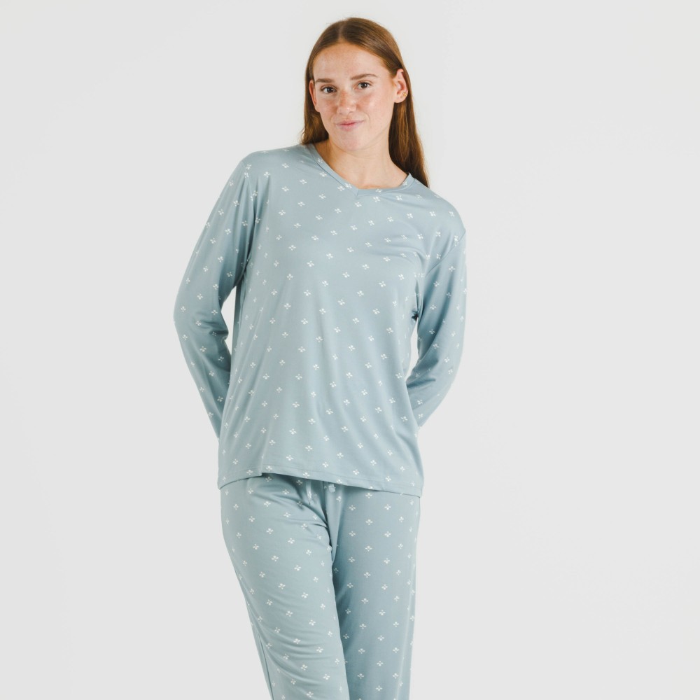 Pijama de mujer modelo Embera indigo compuesto por camiseta de manga larga y pantalón largo de tacto suave.