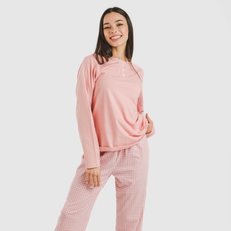 Pijama largo de mujer modelo Cuadro Vichy rosa.