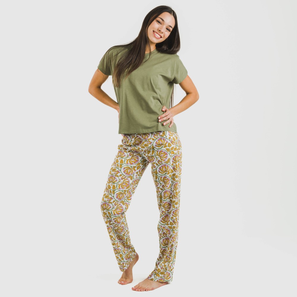 El pijama incluye una camiseta de manga corta con manga fluida en color verde cacería y un pantalón largo blanco con estampado de flores en tonos mostaza, verdes y lilas.