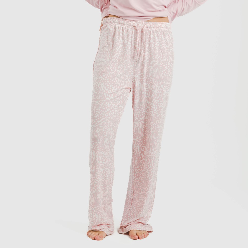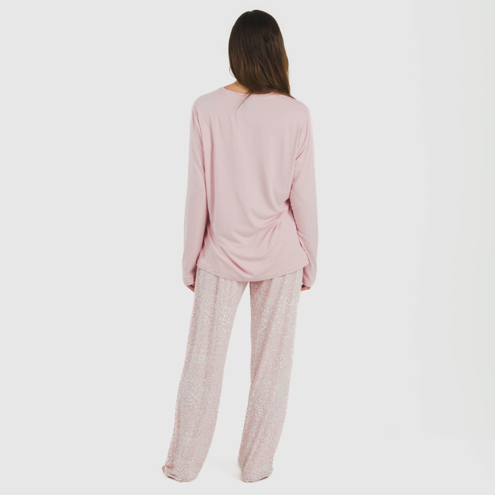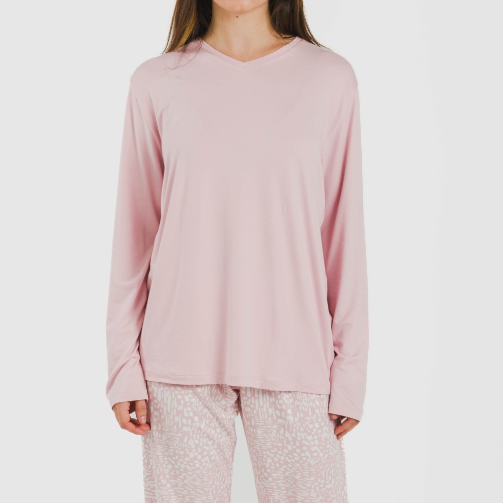 Pijama de mujer modelo Maty rosa compuesto por camiseta de manga larga y pantalón largo de tacto suave.