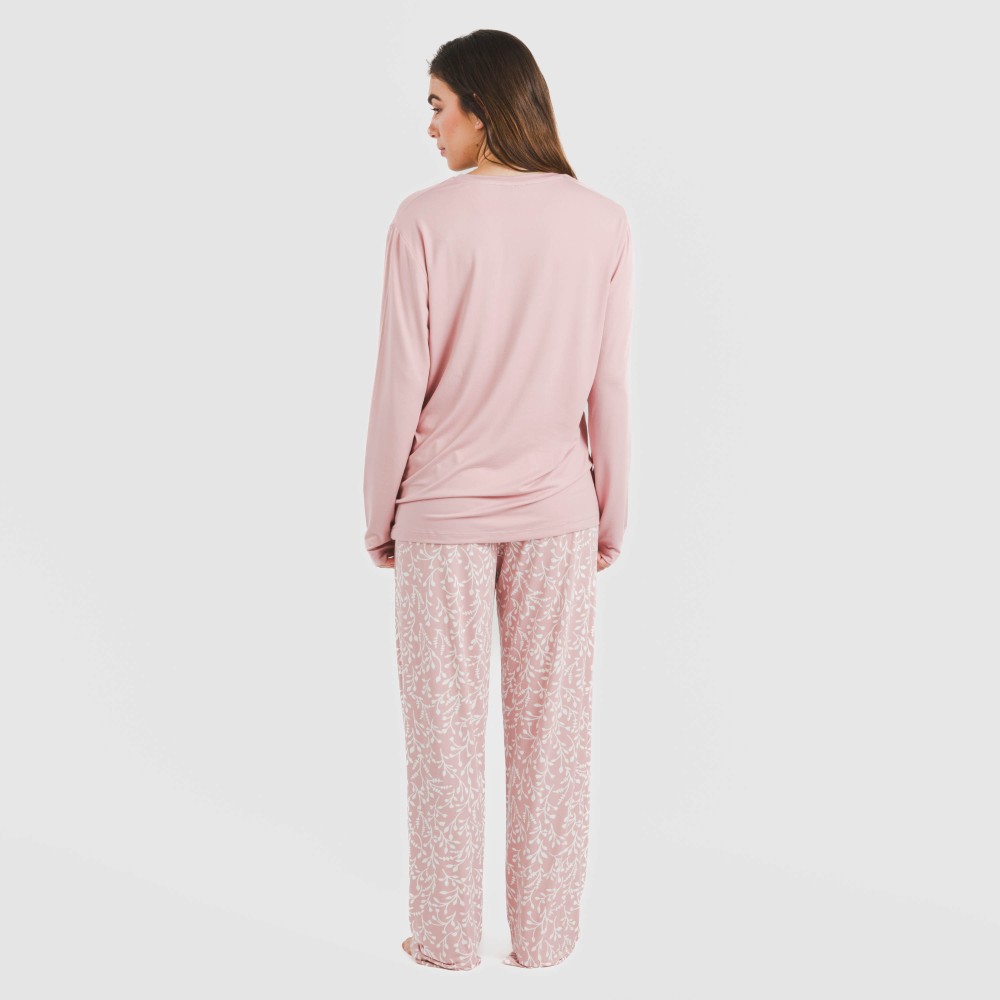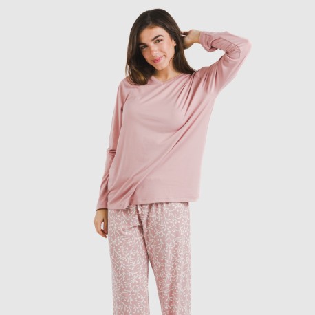 Pijama de mujer modelo Lauri rosa compuesto por camiseta de manga larga y pantalón largo de tacto suave.