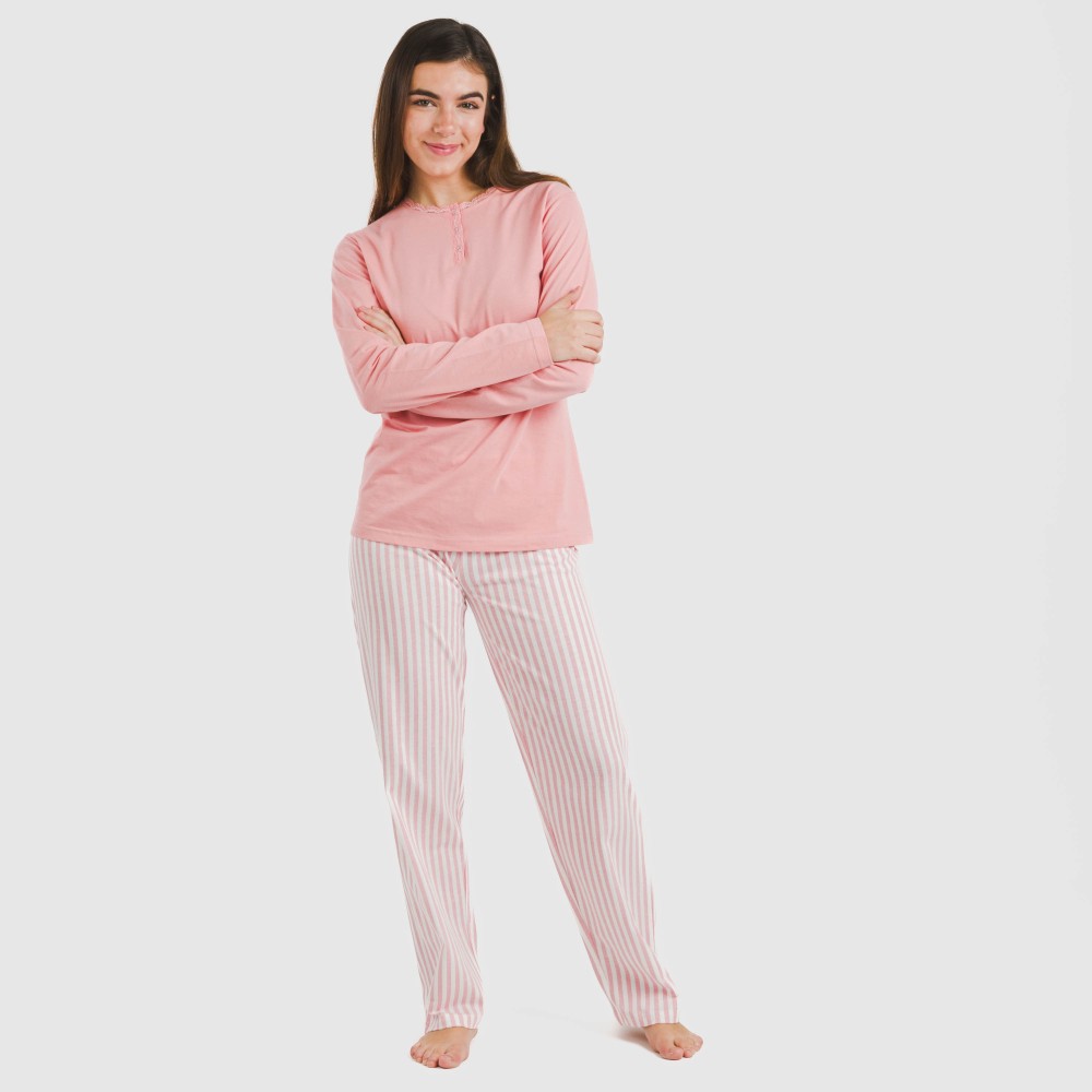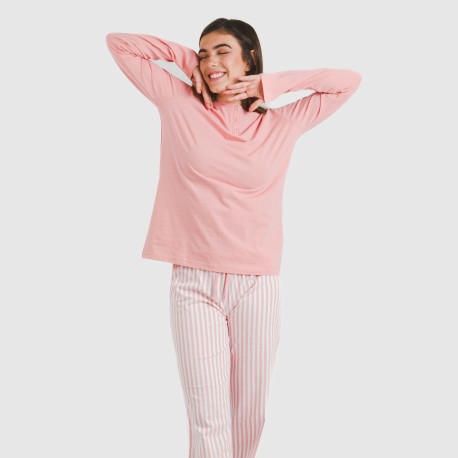 El pijama se conforma de una camiseta lisa de manga larga en color marsala con tres botones pequeños en la parte del cuello y un pantalón blanco con rayas rosas.