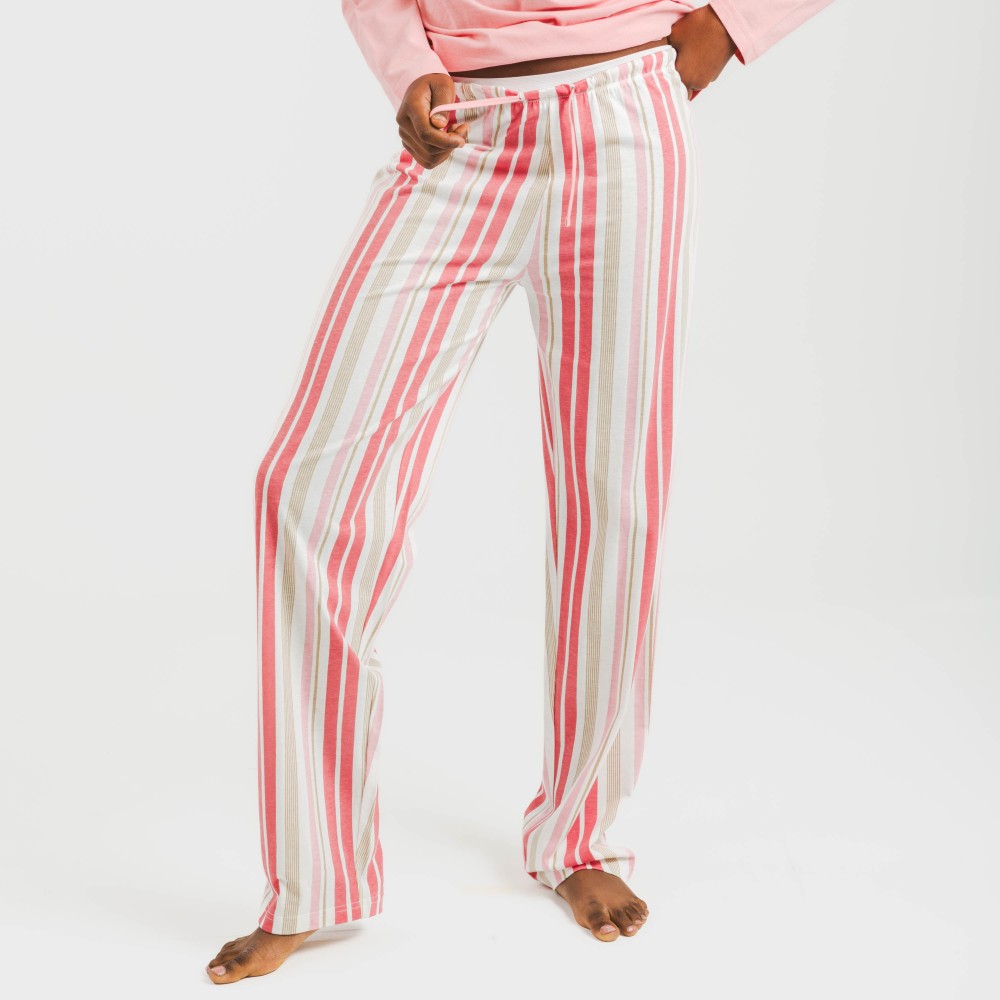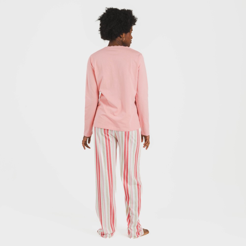 El pijama se conforma de una camiseta lisa de manga larga en color rosa con tres botones pequeños en la parte del cuello y un pantalón blanco con rayas rosas y beiges.
