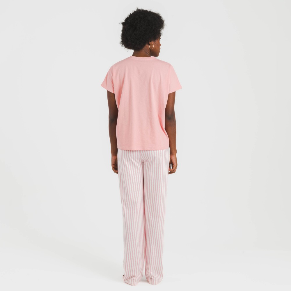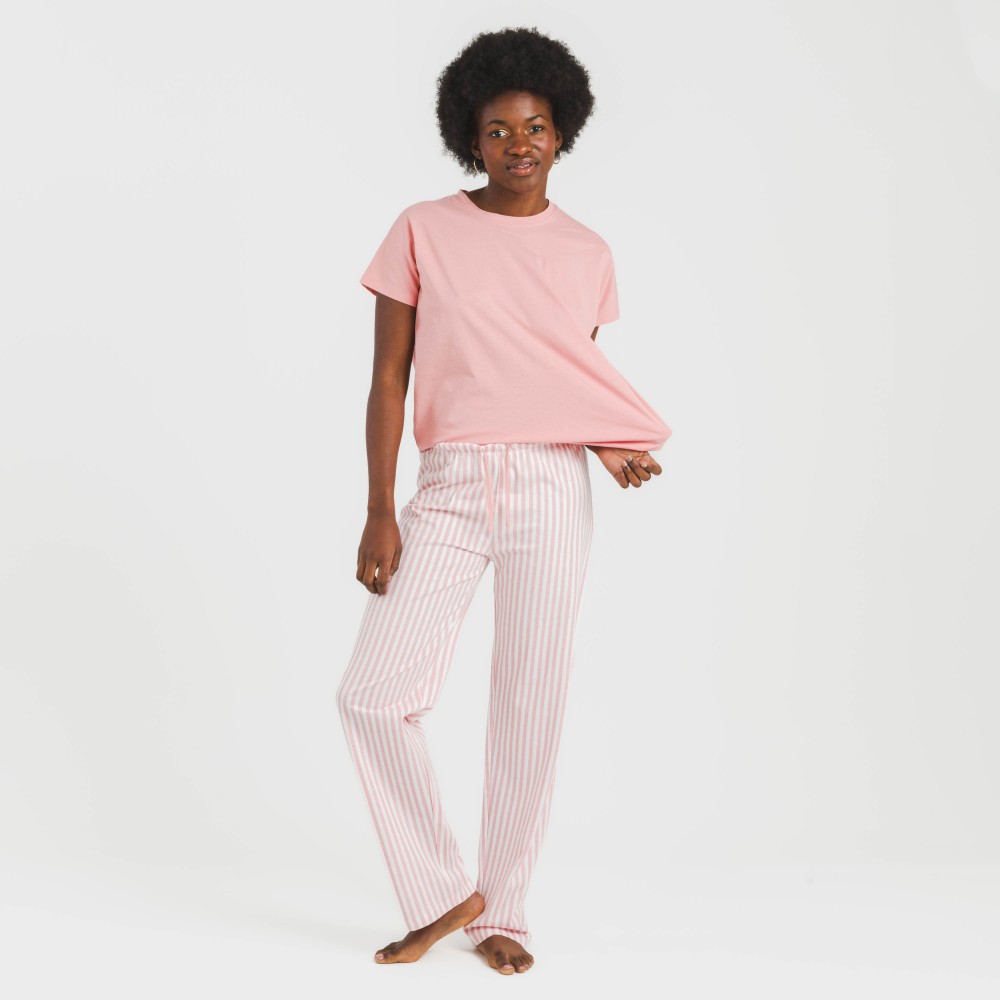 El pijama incluye una camiseta de manga corta con manga fluida en color rosa y un pantalón largo blanco con rayas rosas.