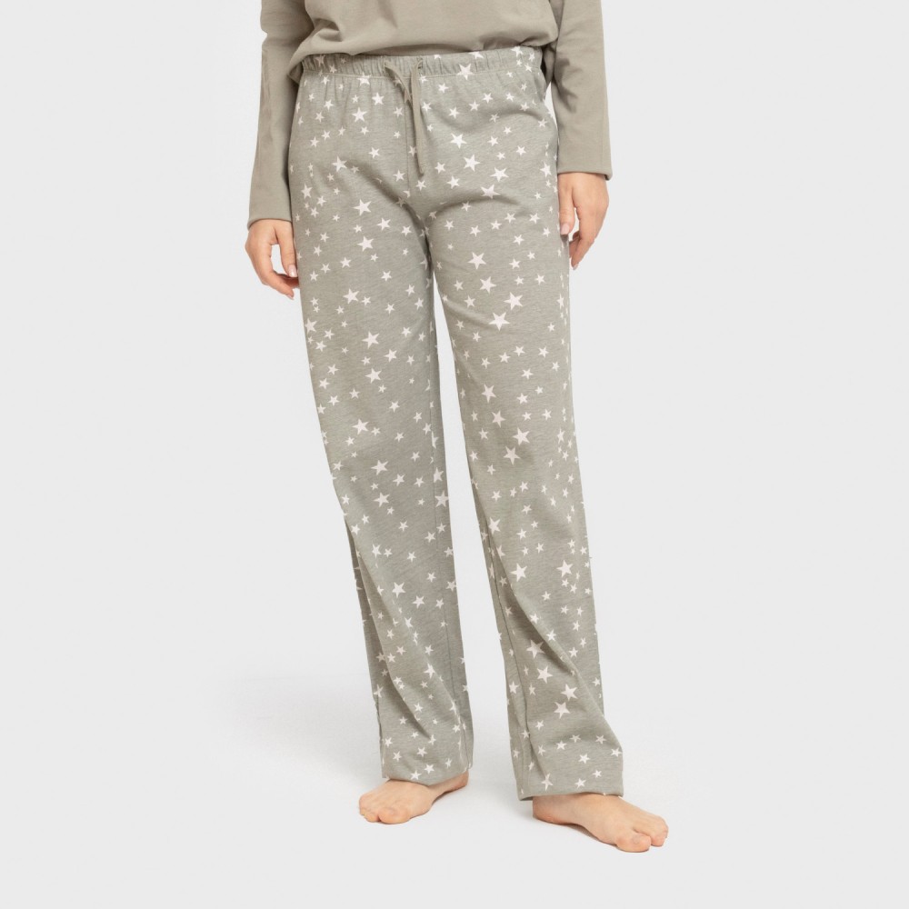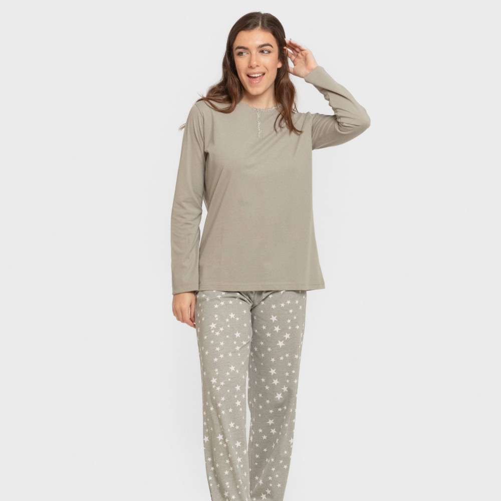 El pijama se conforma de una camiseta lisa de manga larga en color verde con tres botones pequeños en la parte del cuello y un pantalón con estampado de estrellas blancas sobre un fondo verde. El pantalón del pijama tiene la cintura elástica recubierta con una cinta para ajustar.