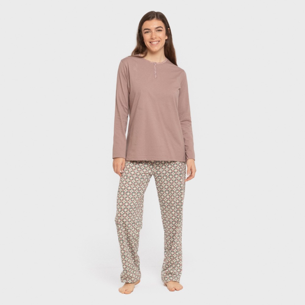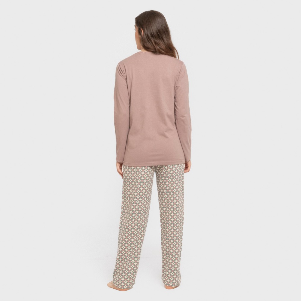 El pijama se conforma de una camiseta lisa de manga larga en color berenjena con tres botones pequeños en la parte del cuello y un pantalón con estampado geométrico de diferentes figuras blancas y rosas sobre un fondo gris. El pantalón del pijama tiene la cintura elástica recubierta con una cinta para ajustar.