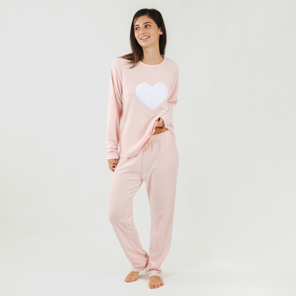 Pijama cómodo con camiseta de color rosa con un corazón blanco en el centro y pantalón liso de color rosa palo. Tejido extra suave y calentito, ideal para el invierno.