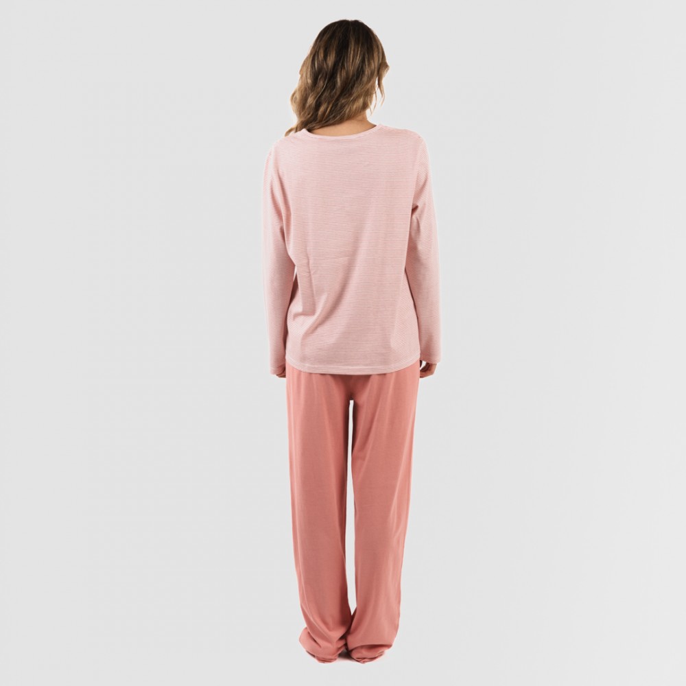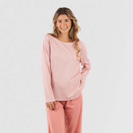 Pijama de mujer compuesto por camiseta manga larga de algodón 100% y pantalón largo. El pantalón del pijama tiene la cintura elástica recubierta con una cinta para ajustar.