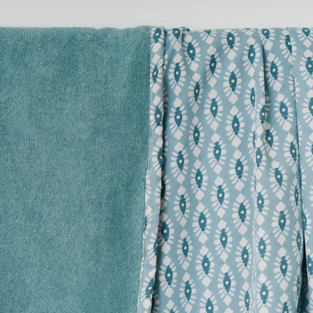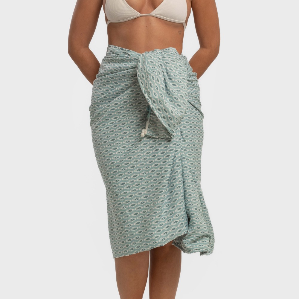 El conjunto incluye un pareo y un bolso con estampado discreto en tonos azules y blanco sobre un fondo agua marina.