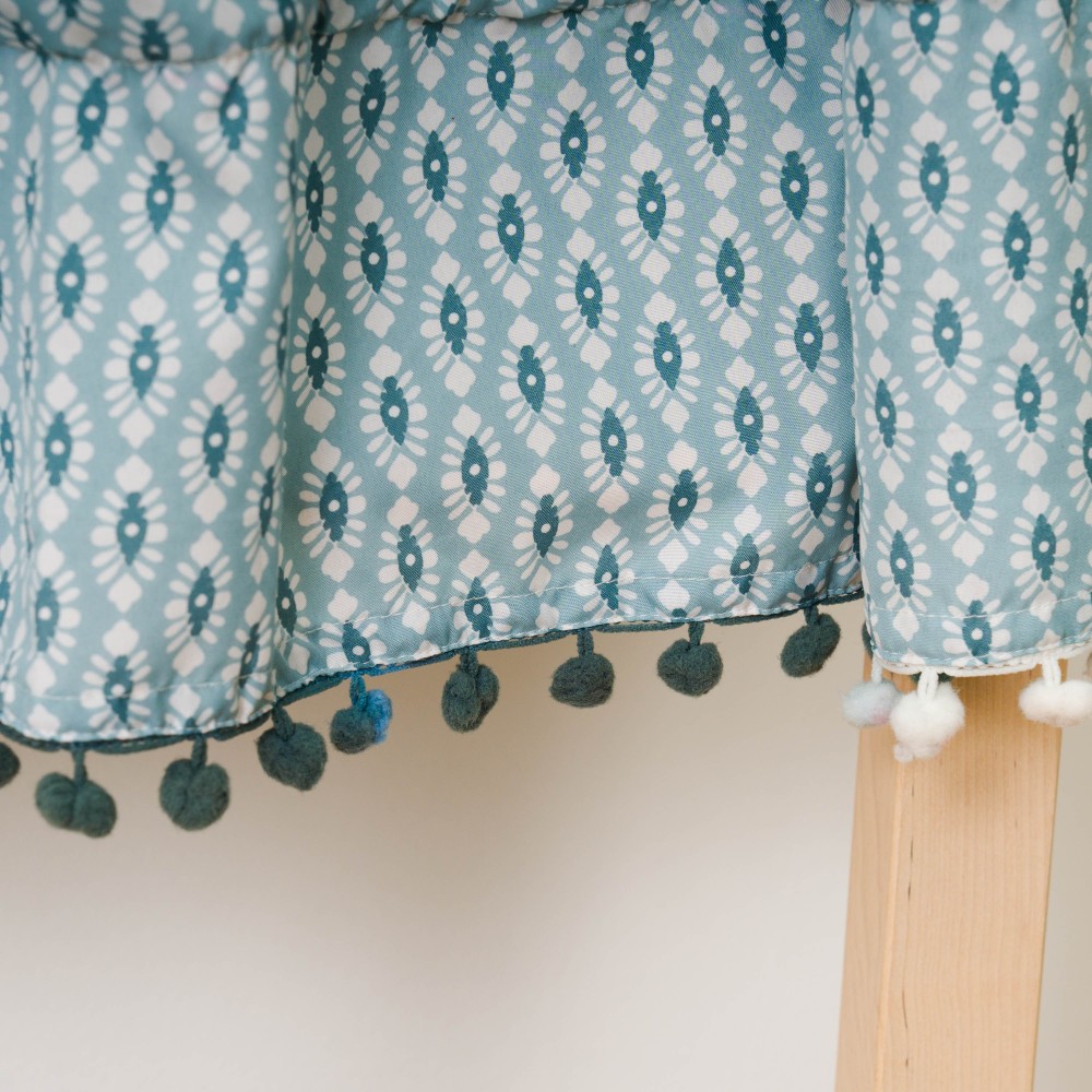 El pareo cuenta con tejido de rizo por la parte trasera y detalles de madroños en diferentes colores en los extremos.