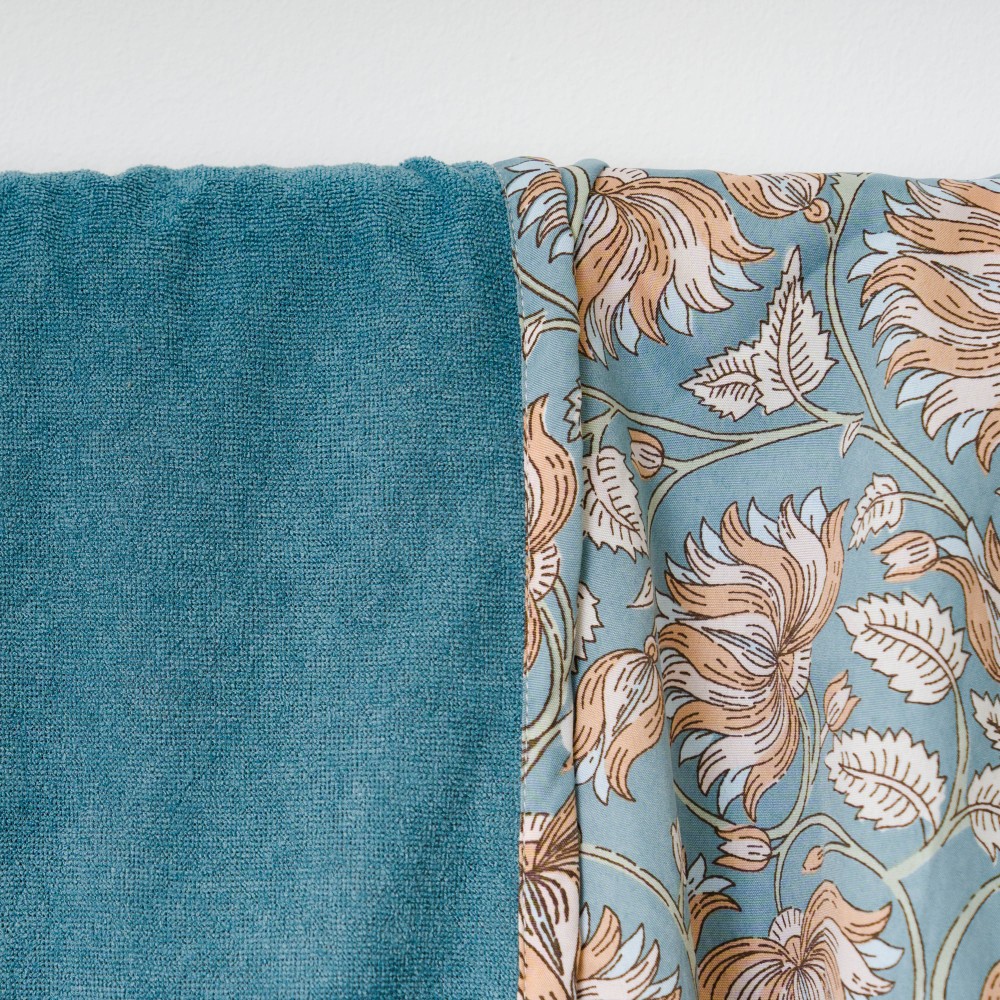 El conjunto incluye un pareo y un bolso con un estampado de flores y hojas en tonos marrones, azules y verdes sobre un fondo azul oscuro.