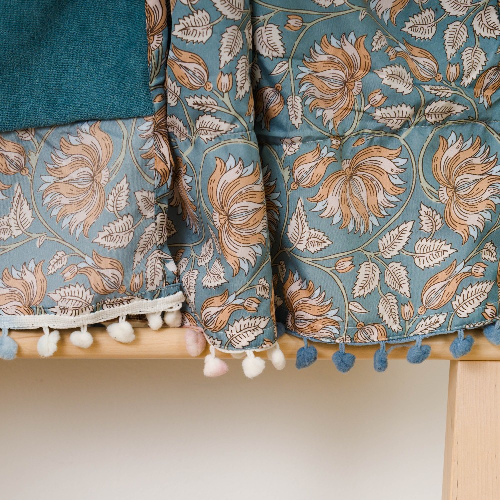 El pareo cuenta con tejido de rizo por la parte trasera y detalles de madroños en diferentes colores en los extremos.