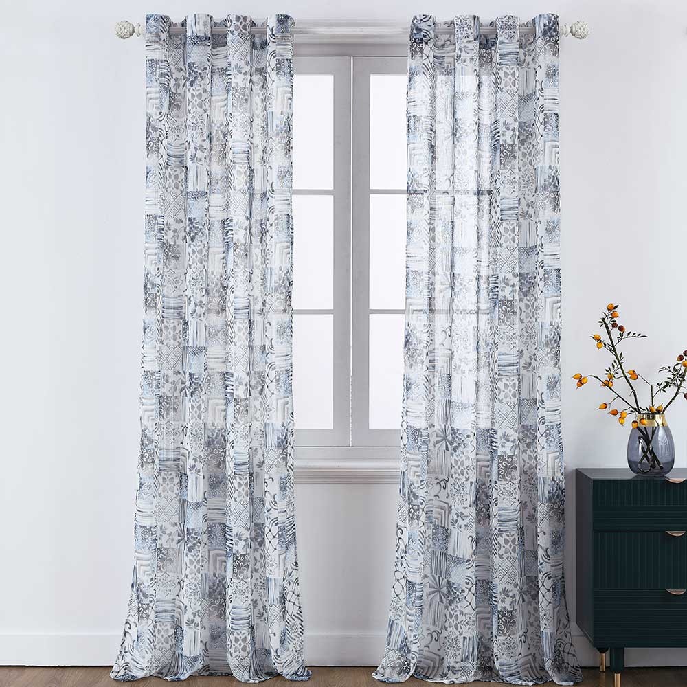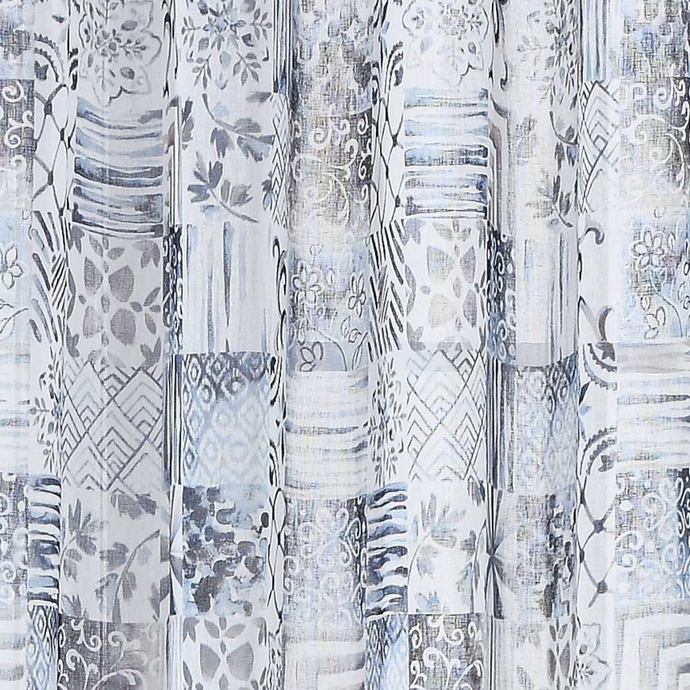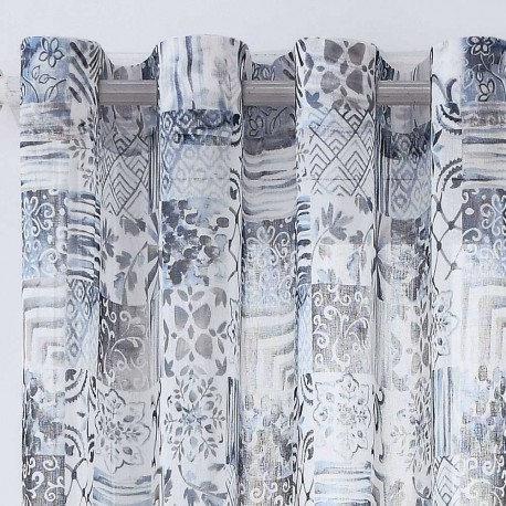 Cortina semitranslúcida de color azul con diferentes estampados originales de figuras y flores. Una pieza única, que dará estilo y elegancia a la habitación .