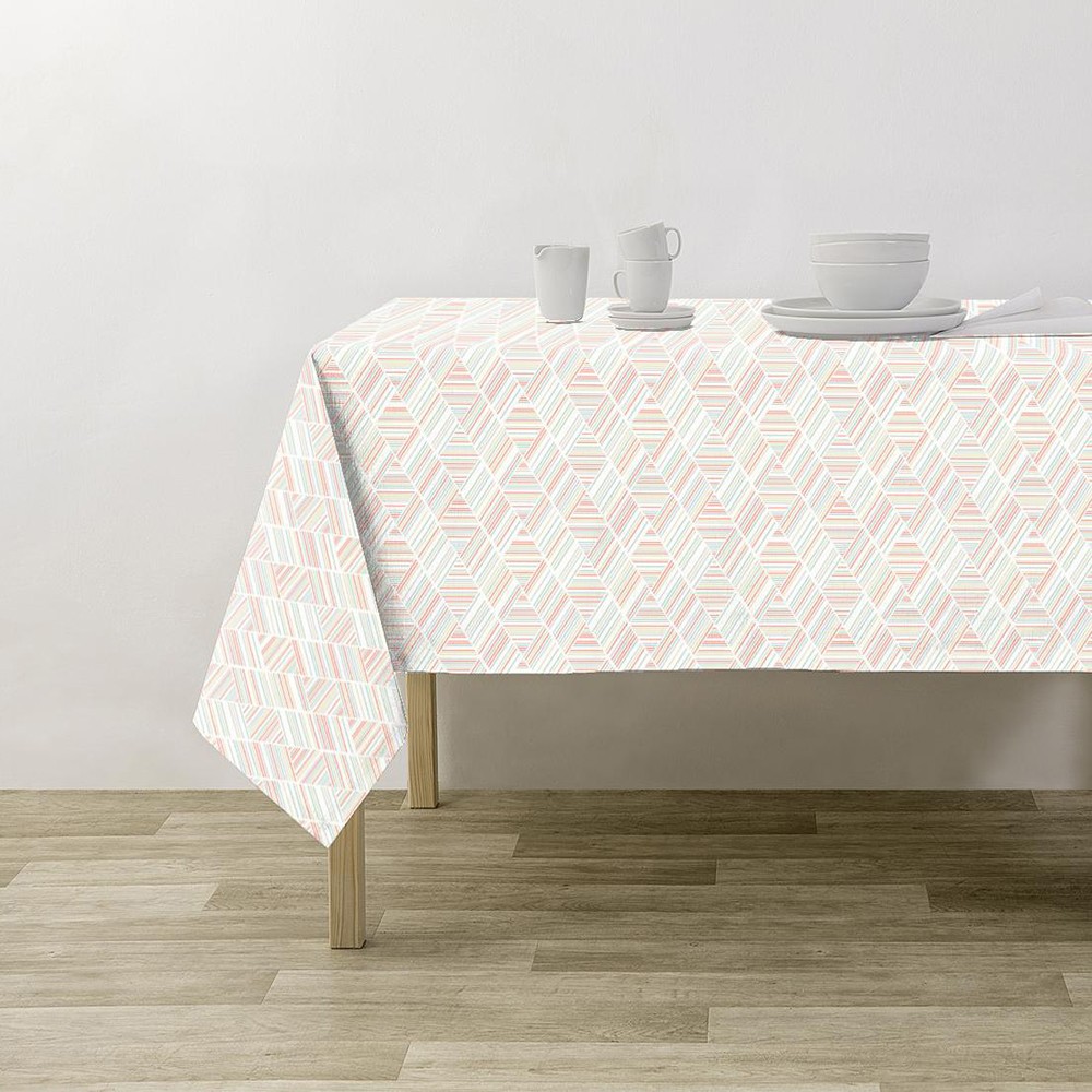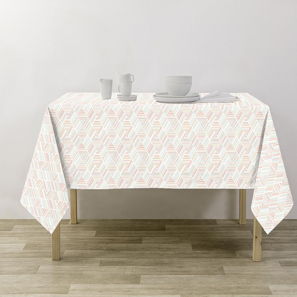 Mantel modelo Tropers rosa de tejido reciclado, que repele los líquidos y evita la formación de manchas.