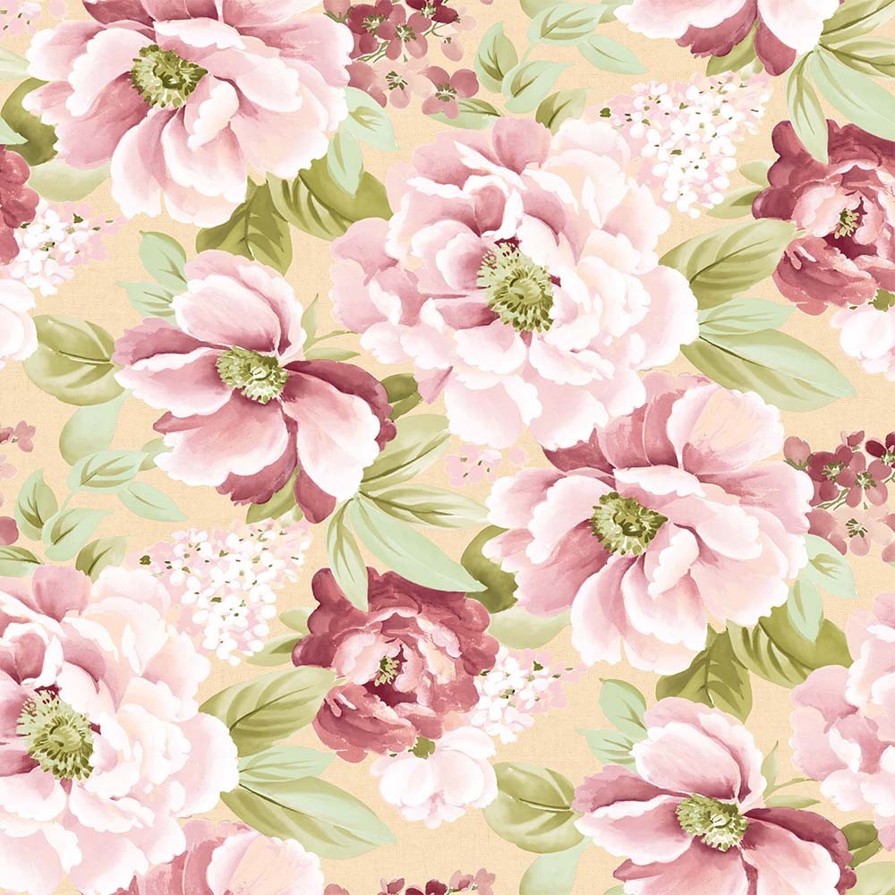 Estampado de grandes flores en tonos rosas y blanco con hojas de color verde . Un diseño con clase que quedará sensacional en el comedor aportando alegría y color.