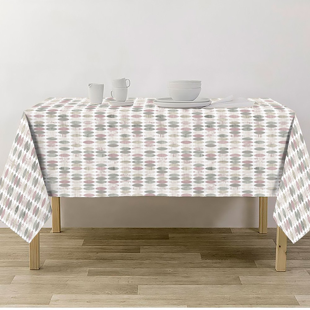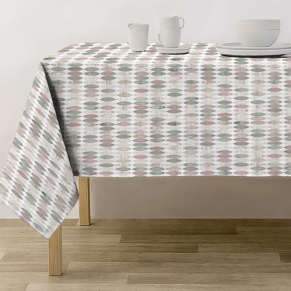 Estampado en forma de zepelin con tonos malva y morado con fondo blanco. Un diseño con clase que quedará sensacional en el comedor.