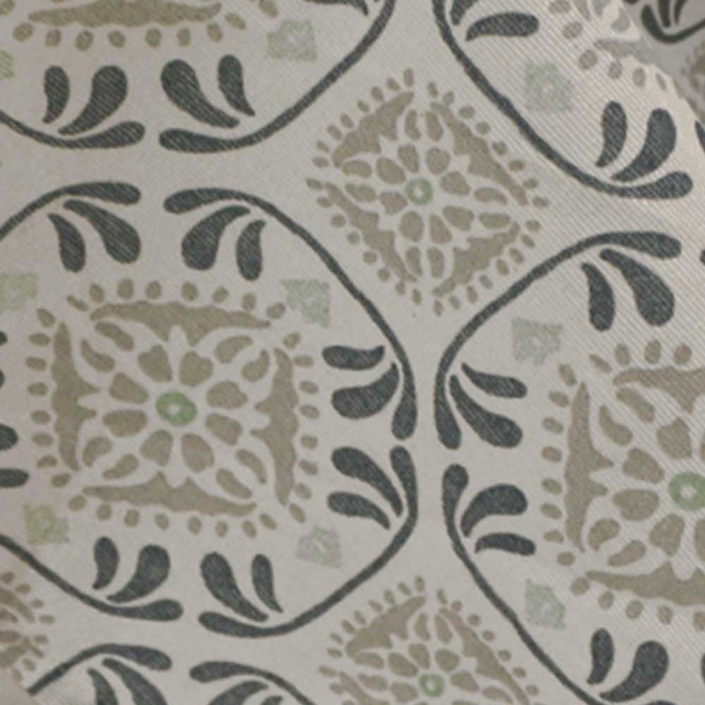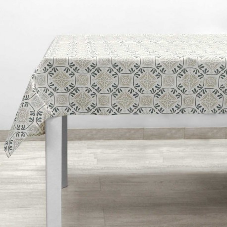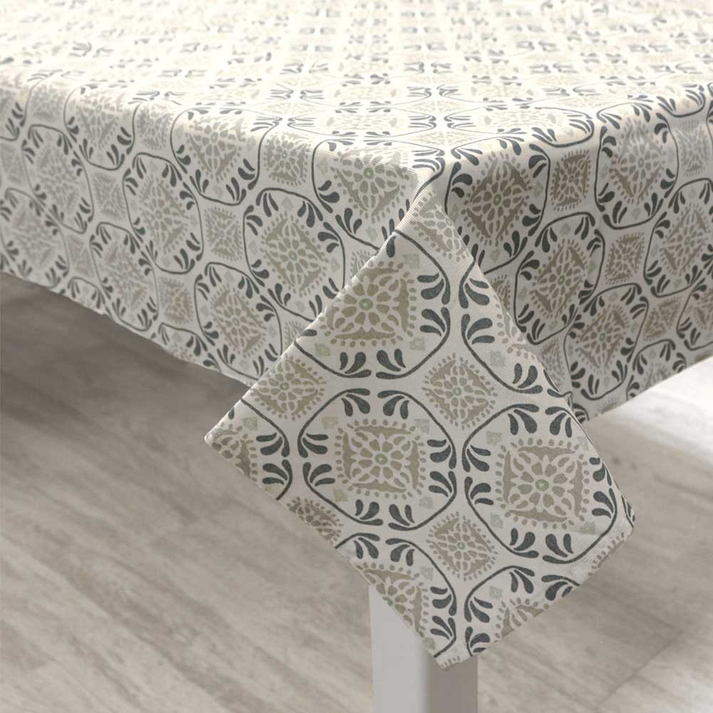 Estampado clásico y sencillo de formas geométricas formando flores y rombos con un toque diferente en tonos azules y grises sobre un fondo natural. Un diseño con clase que quedará sensacional en el comedor.