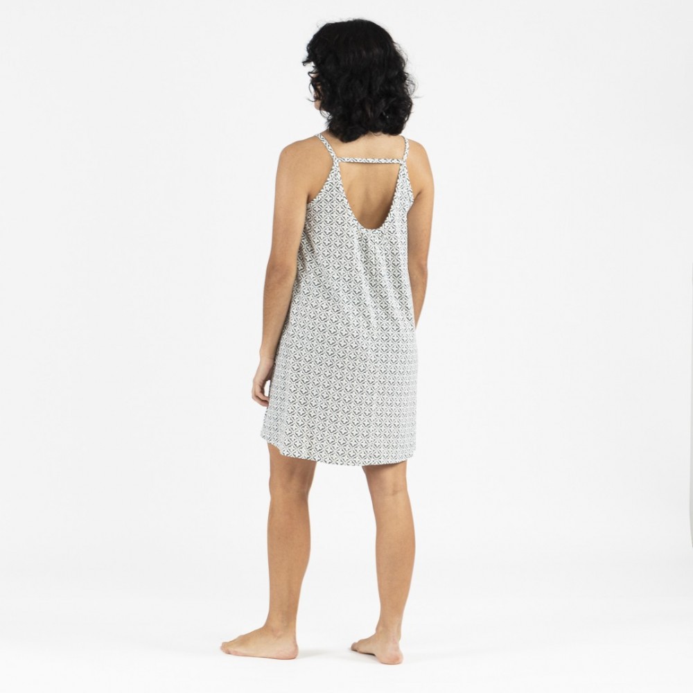 Su diseño es estampado de tirantes con escote redondo y espalda con pequeña abertura unida en el centro por una fina tira.