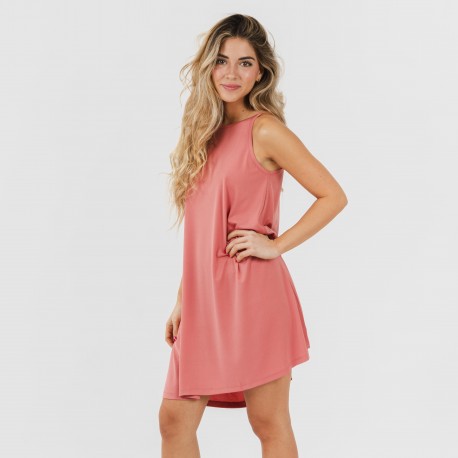 Su diseño es sencillo de color liso, la espalda tiene una pequeña abertura unida por una fina tira que lo hace el vestido perfecto para estar cómoda y sin pasar calor en los días de verano.