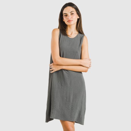 Vestido corto de color liso, con cuello redondo y tirantes anchos. Una prenda cómoda con un tejido ligero, perfecta para el verano.