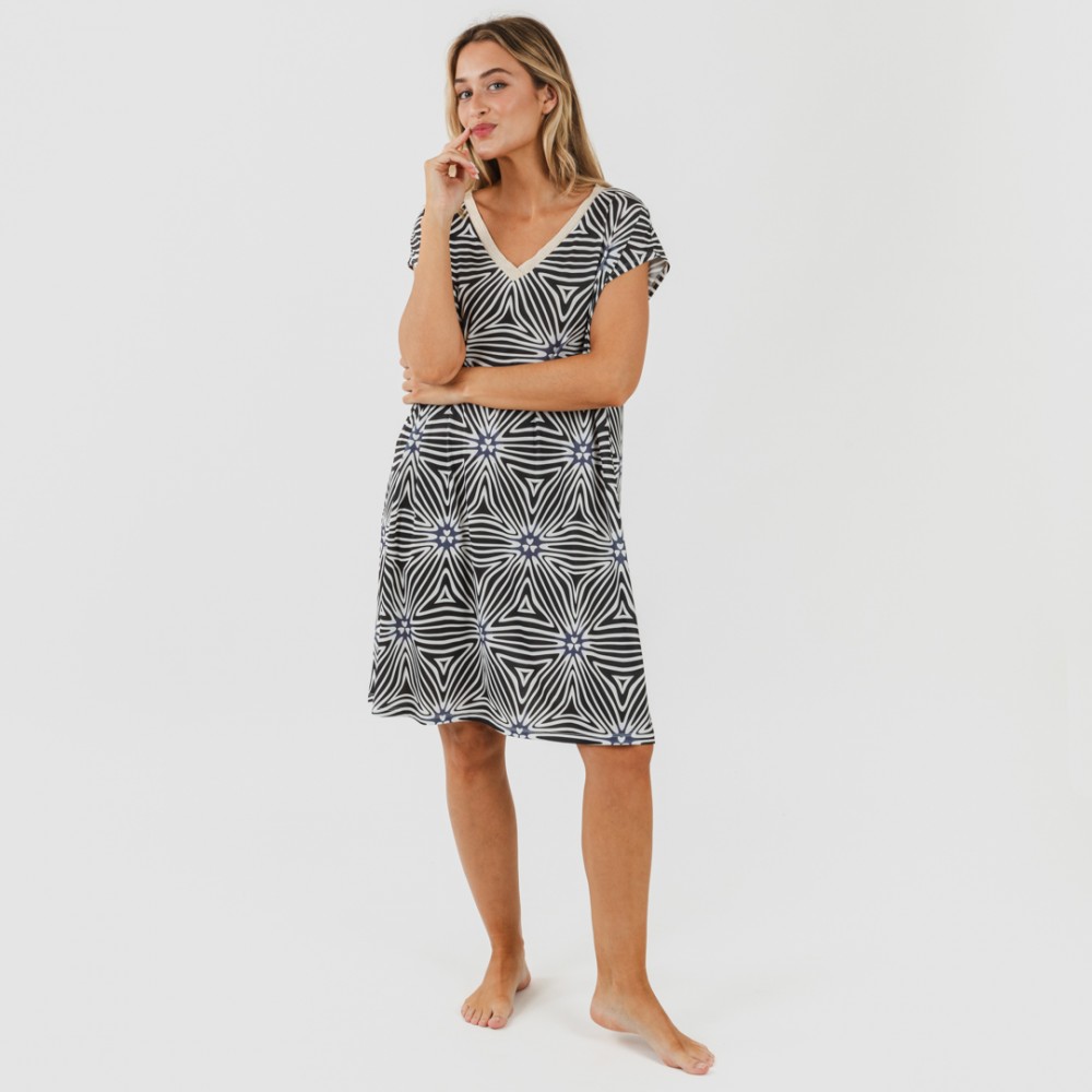 Vestido corto con manga fluida y escote en pico con detalle de color blanco brillante. Su diseño presenta un estampado de rayas formando flores en color blanco sobre un fondo negro.