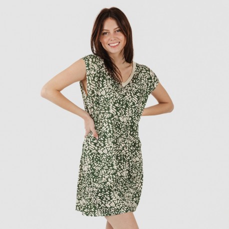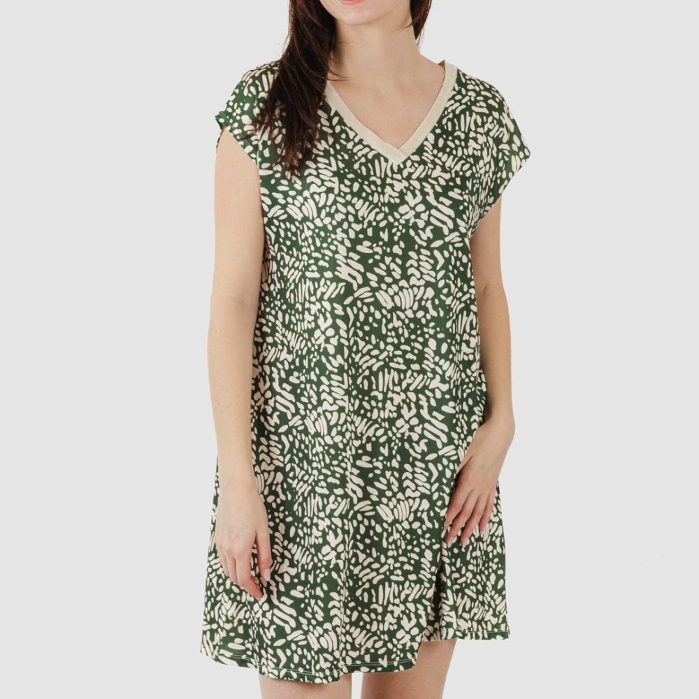 Vestido corto con manga fluida y escote en pico con detalle de color blanco brillante. Su diseño presenta un estampado en color blanco sobre un fondo verde cacería.