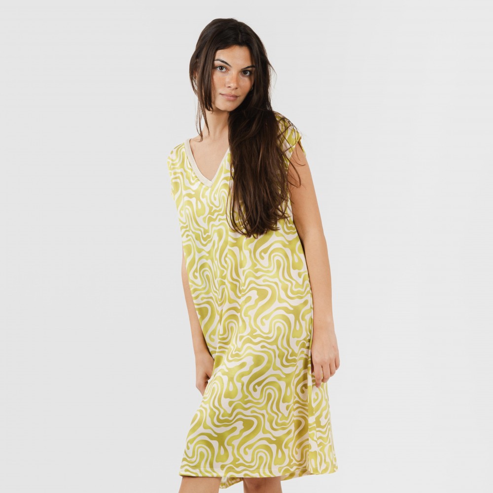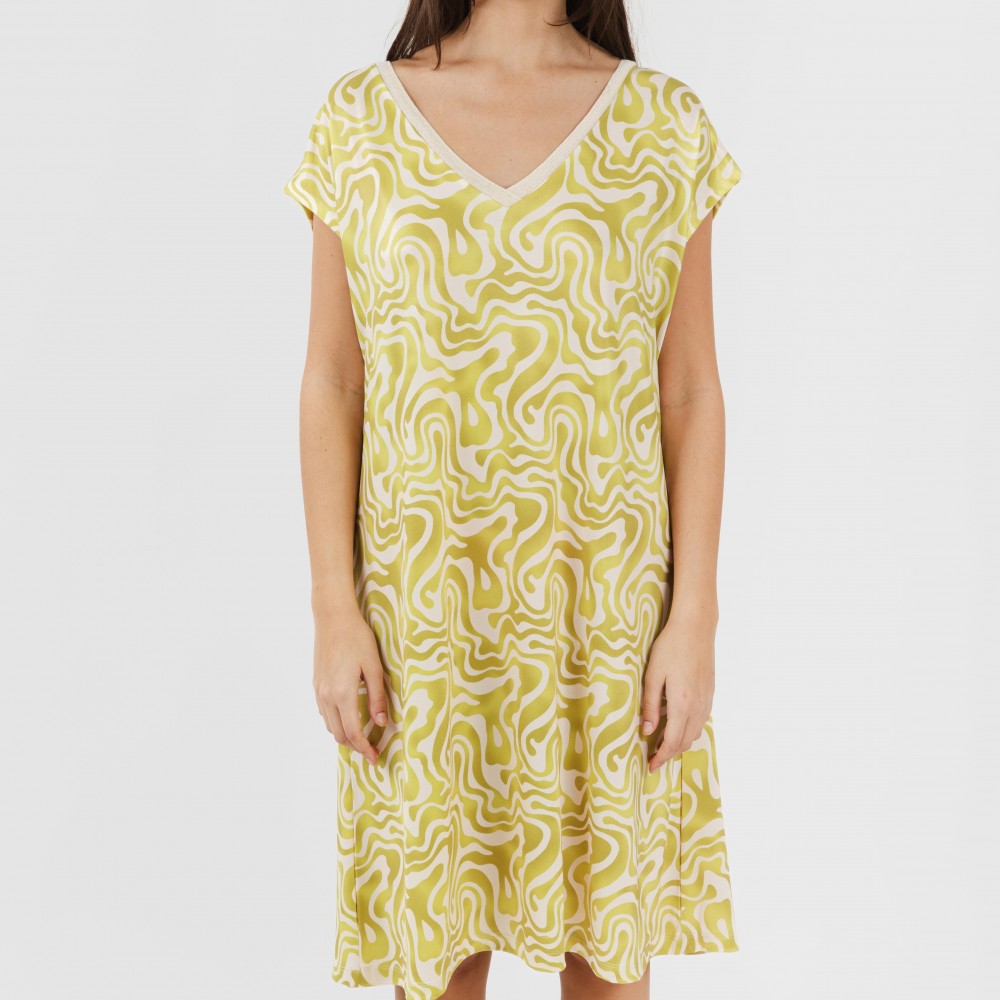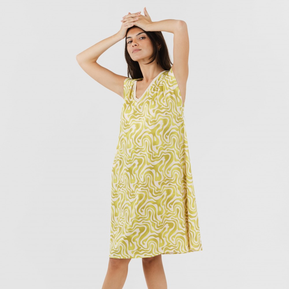 Vestido corto con manga fluida y escote en pico con detalle de color blanco brillante. Su diseño presenta un estampado de ondulaciones en color verde lima sobre un fondo blanco.
