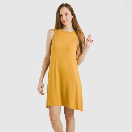 Vestido corto de corte irregular y tirantes anchos. Su diseño es sencillo de color liso y con tejido viscosa, una prenda idel para ir a la playa o a la piscina en los días de verano.