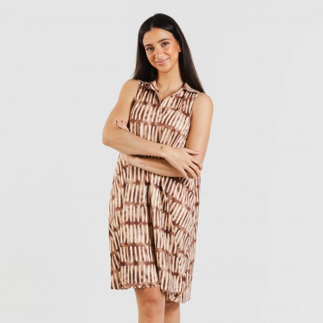 Vestido corto de tacto suave con cuello y solapa. Su diseño presenta un estampado de pequeñas rayas blancas sobre un fondo marrón desgastado.