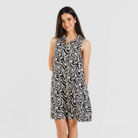 Vestido corto de tacto suave con cuello y solapa. Su diseño presenta un estampado de ondulaciones en color negro sobre un fondo beige.