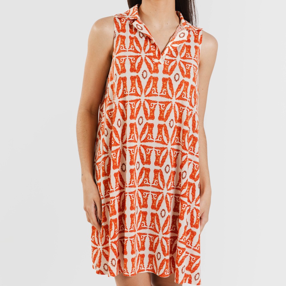 Vestido corto de tacto suave con cuello y solapa. Su diseño presenta un estampado geométrico de diferentes figuras en color beige sobre un fondo teja.