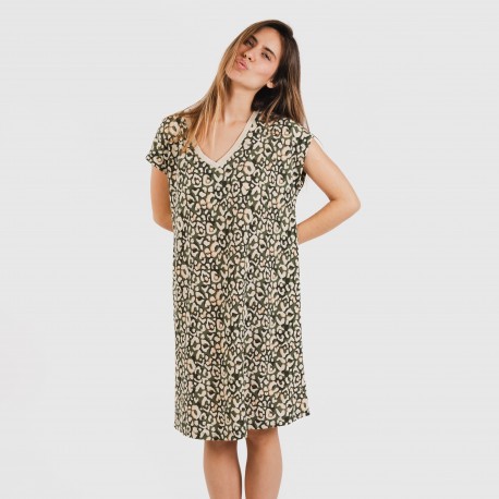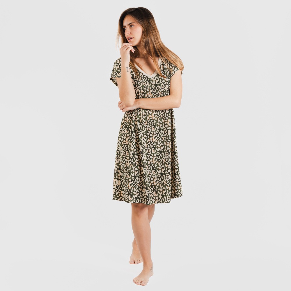 Vestido corto con manga fluida y escote en pico con detalle de color blanco brillante. Su diseño presenta un estampado de diferentes manchitas en tonos blancos y beiges sobre un fondo verde cacería.