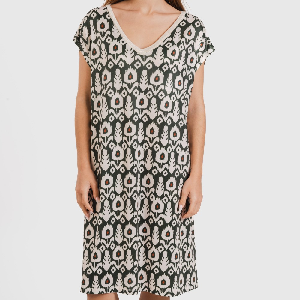 Vestido corto con manga fluida y escote en pico con detalle de color blanco brillante. Su diseño presenta un estampado original con flores y hojas de color blanco sobre un fondo verde cacería.