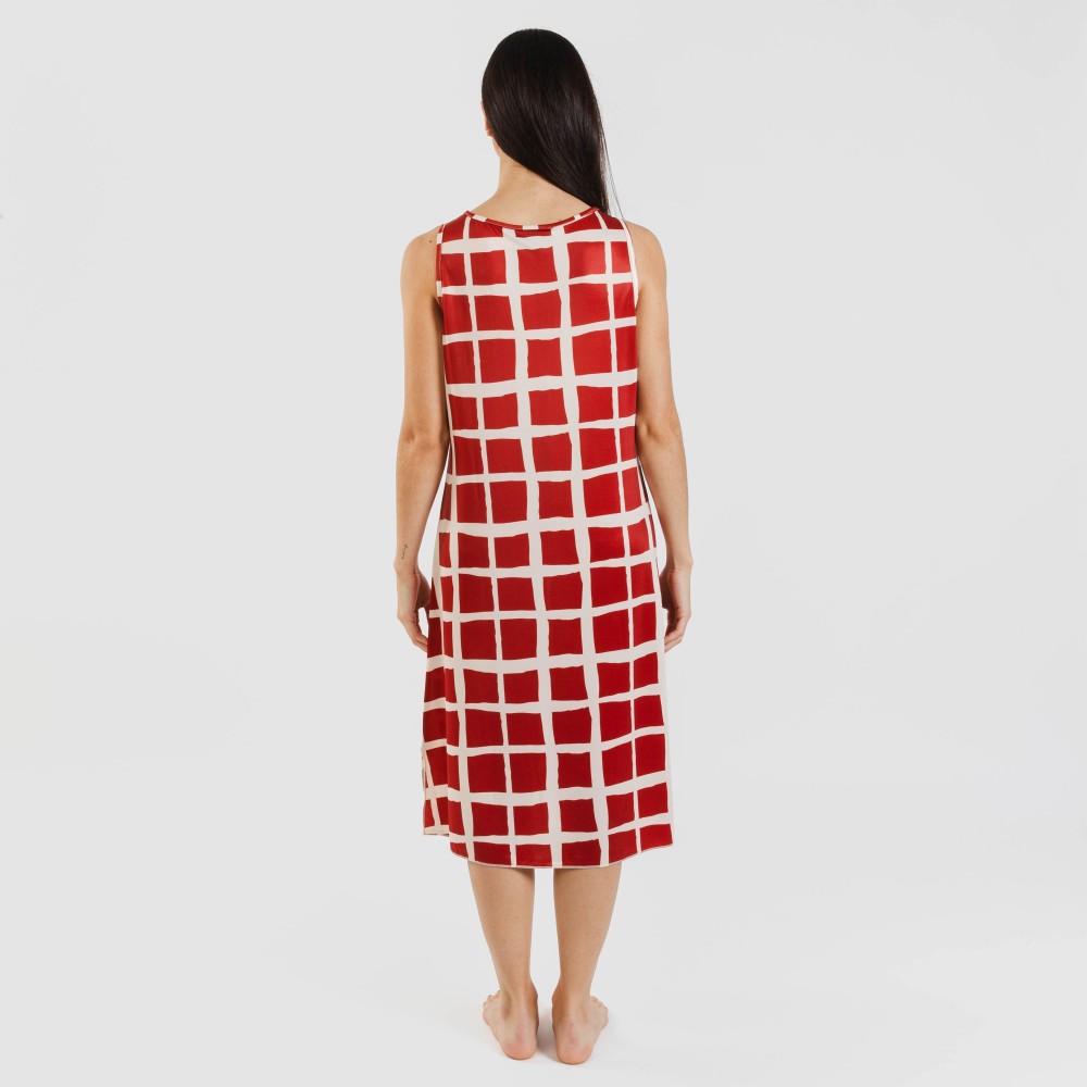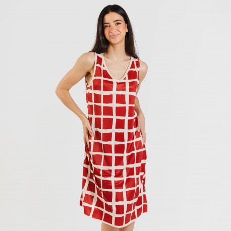 Vestido de corte midi con tirantes anchos y escote en pico con detalle de color blanco brillante. Su diseño presenta un estampado de rayas horizontales y verticales de color blanco sobre un fondo teja.