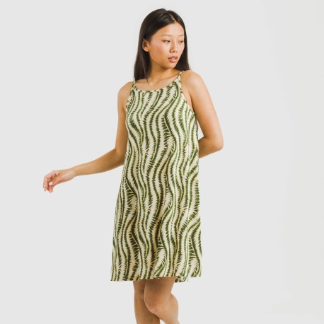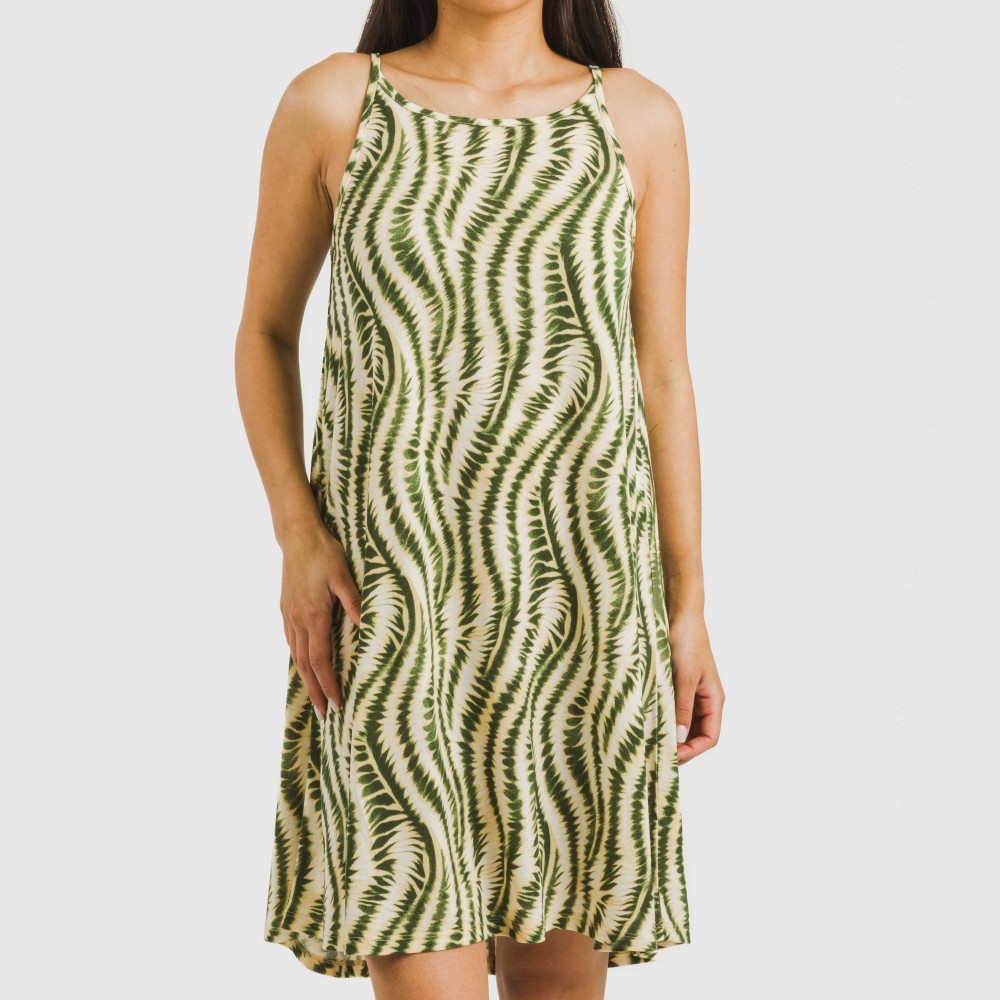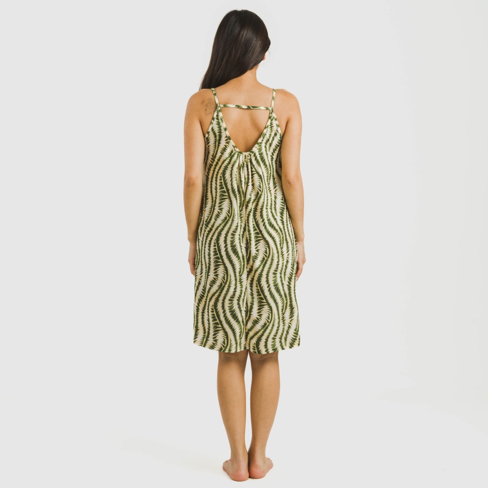 Su diseño presenta un estampado de diferentes ondas verdes sobre un fondo beige, la espalda tiene una pequeña abertura unida por una fina tira que lo hace el vestido perfecto para estar cómoda y sin pasar calor en los días de verano.