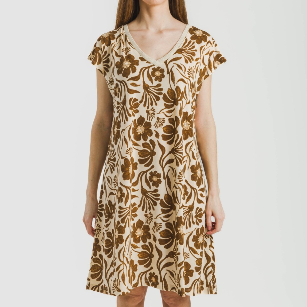 Vestido corto con manga fluida y escote en pico con detalle de color blanco brillante. Su diseño presenta un estampado de diferentes flores marrones sobre un fondo blanco natural.